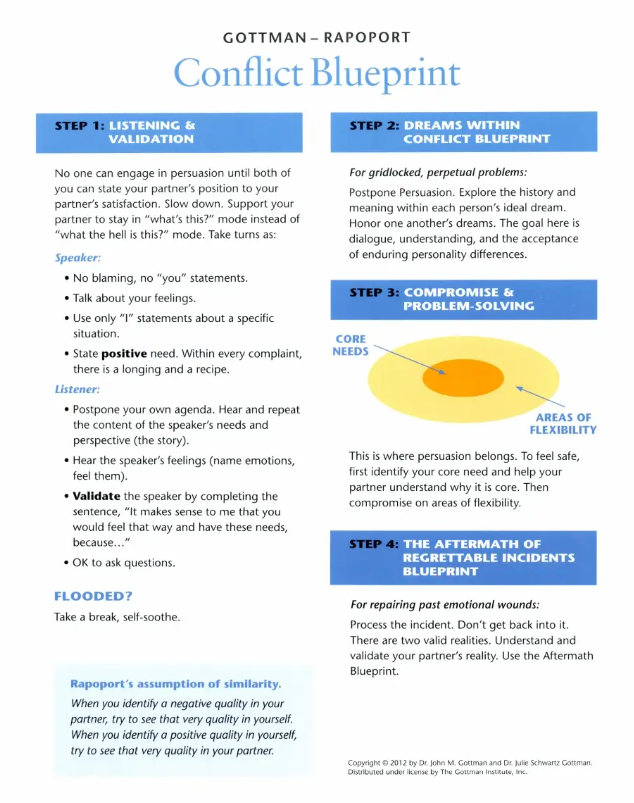 When conflict arises, gently bring it up then speak and listen in a way that validates each other’s experience. If there’s gridlock, try thinking about what deeper meaning is connected to the conflict and share it. After you truly understand each other and validate each other’s reality, problems tend to resolve or lead to compromise experiments. When regrettable incidents arise, ease into an aftermath conversation to repair. Turn toward each other and tackle repair attempts as a team. This is your blueprint.